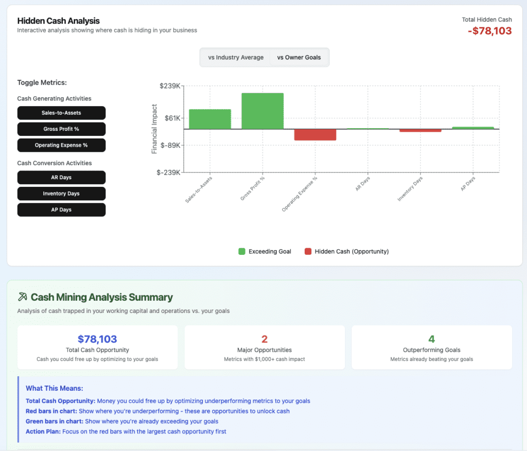 See exactly what’s driving the issue — inventory creep, slow receivables, margin compression, debt load, cost structure.